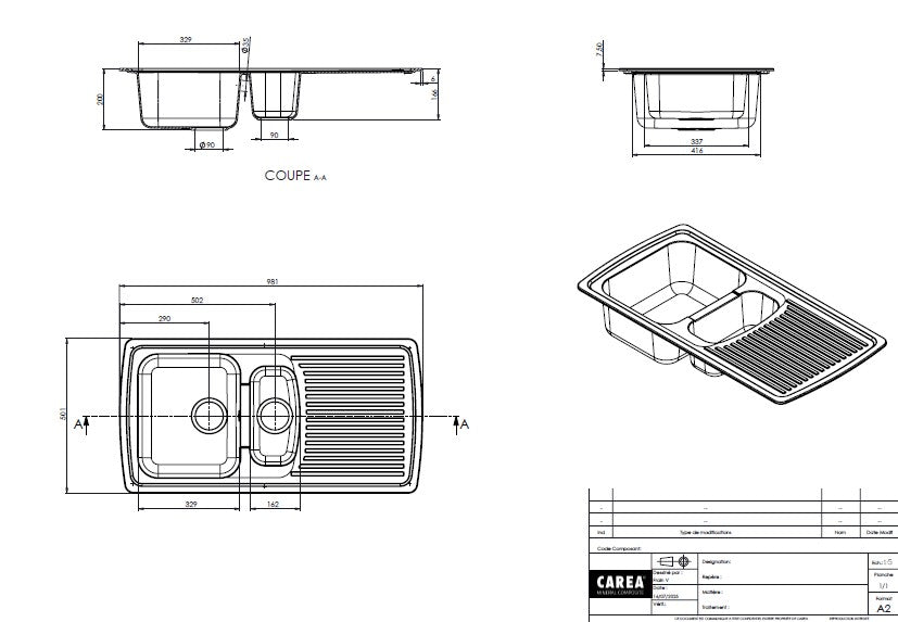 - Surface : lisses ou légèrement grainés, les éviers CAREA® sont très facile d'entretien, l'utilisation d'une éponge et d'une crème à récurer, ou l'utilisation de la pierre blanche permet de garder votre évier propre facilement.