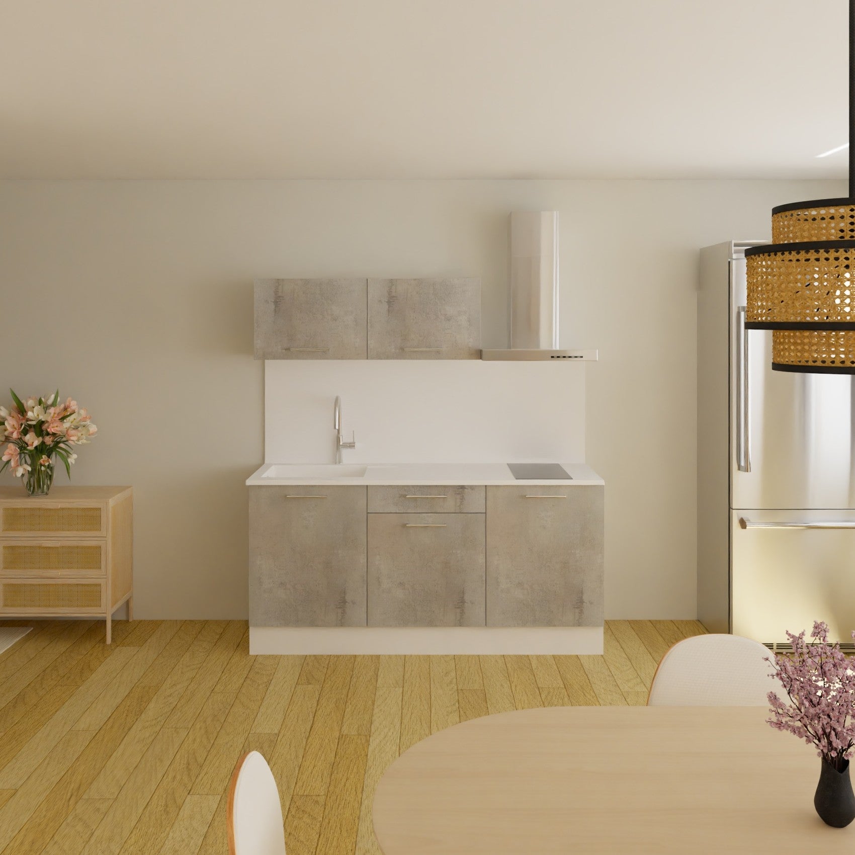 Pack cuisine ESSENTIEL: meubles livrés en kit, caisson et plinthe en mélaminé blanc; seules les façades sont décorées.